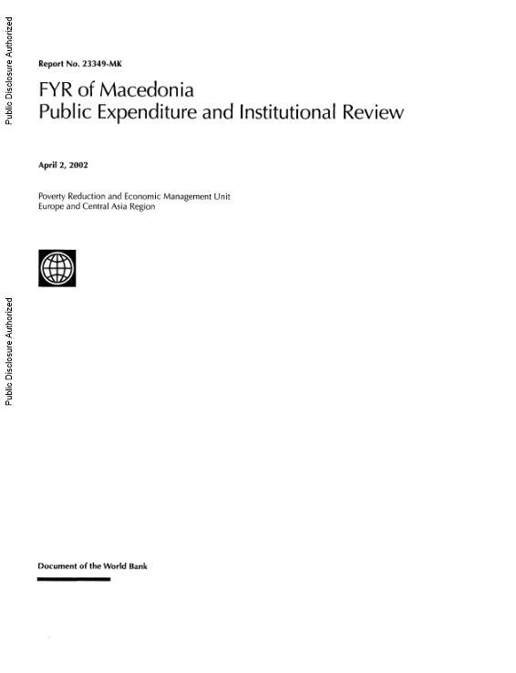 This Public Expenditure and Institutional Review (PEIR) has been prepared for the Government of FYR Macedonia. A World Bank team, working with Government officials and other donors, including the European Union (EU) and the United Kingdom's Department for International Development (DFID), completed the first draft for discussion with the Government in 2000. This version, finalized at the beginning of 2002, updates the analysis and reflects the Government's comments.