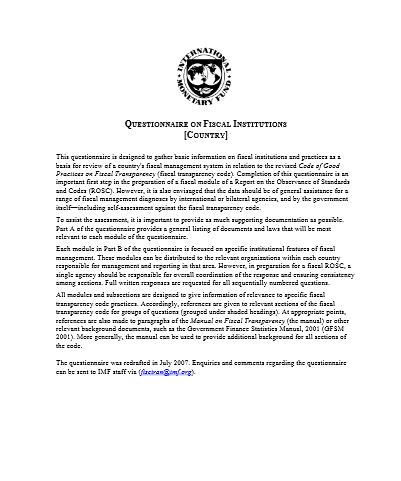 This questionnaire is designed to gather basic information on fiscal institutions and practices as a basis for review of a country's fiscal management system in relation to the revised Code of Good Practices on Fiscal Transparency (fiscal transparency code). Completion of this questionnaire is an important first step in the preparation of a fiscal module of a Report on the Observance of Standards and Codes (ROSC). However, it is also envisaged that the data should be of general assistance for a range of fiscal management diagnoses by international or bilateral agencies, and by the government itself—including self-assessment against the fiscal transparency code.