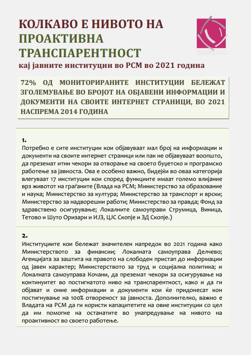 ПРОАКТИВНА ТРАНСПАРЕНТНОСТ претставува објавување/пристапност на документи и информации за работењето на јавните институции, без истите да бидат побарани од страна на граѓаните. Проактивното објавување на документите кои во себе содржат податоци за работењето на јавните институции, со фокус на информации за нивното финансиско работење, претставува основа која им овозможува на граѓаните информирано да се вклучат во процесите на донесување на одлуки, самостојно да бараат промени, или пак да ги повикаат политичките избраници на одговорност.
