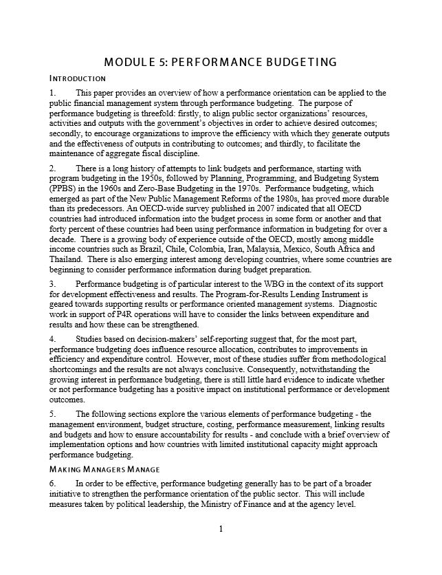 This paper provides an overview of how a performance orientation can be applied to the public financial management system through performance budgeting. The purpose of performance budgeting is threefold: firstly, to align public sector organizations’ resources, activities and outputs with the government’s objectives in order to achieve desired outcomes; secondly, to encourage organizations to improve the efficiency with which they generate outputs and the effectiveness of outputs in contributing to outcomes; and thirdly, to facilitate the maintenance of aggregate fiscal discipline...